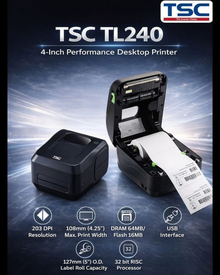 TSC TL240 TL DL Series 4-Inch Performance Desktop Printers. Supports multiple media types, print width up to 108 mm, print length up to 25, 400 mm, print speed is up to 6 ips (152 mm/sec) at 203 dpi resolution Thanks & Regards, Amit Maldikar | Founder DA Excel 09619327212 amit@daexcel.com www.daexcel.com 8, Nahar & Seth Industrial Society , Pannalal Compound, Bhandup West, Mumbai 400078